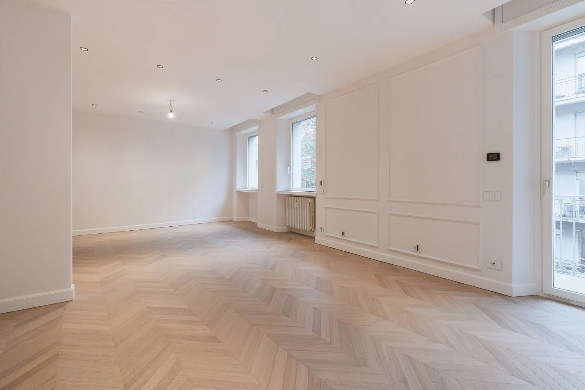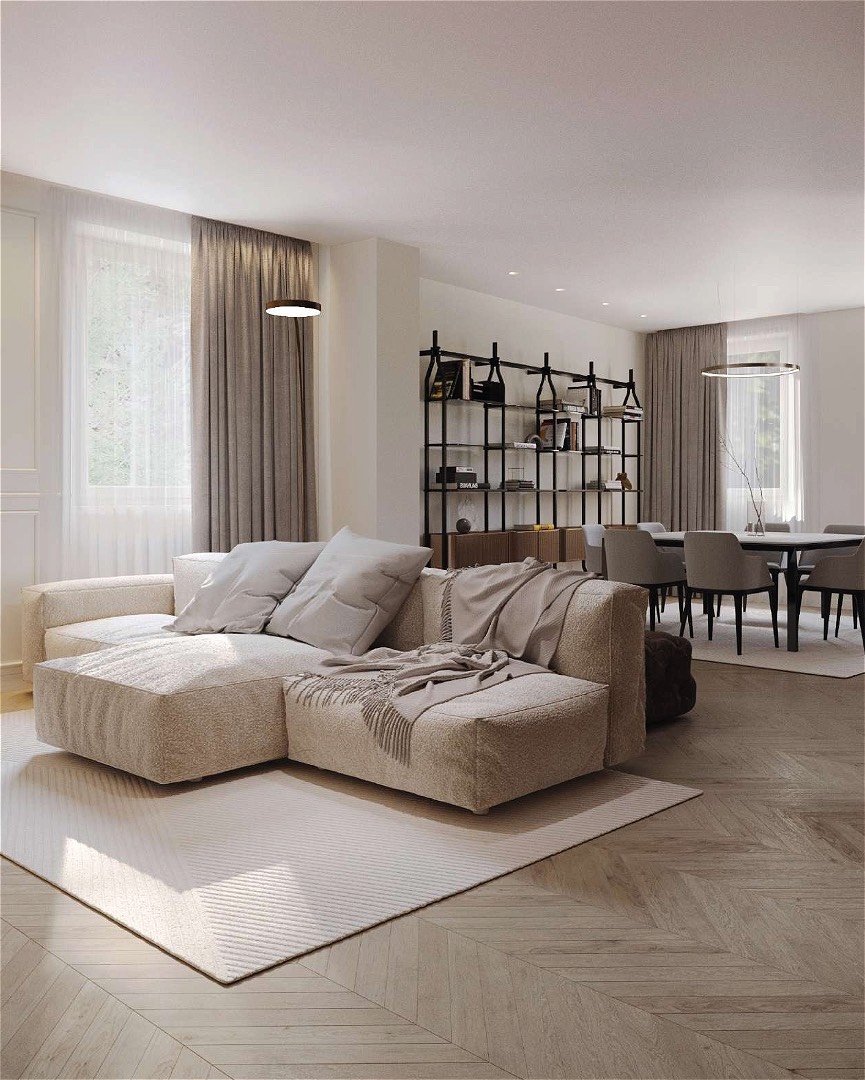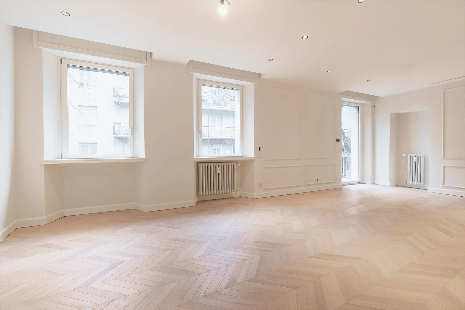 In an elegant building with a white marble facade, this second-floor apartment (with only one other unit on the same level) stands out for its charm and privacy. The entrance is through a marble doorway that leads into a very elegant setting. The residence, set back from the street, has double exposure overlooking two internal courtyards and offers approximately 220 square meters of completely renovated space. The bright and welcoming living area opens onto the living room, dining room, and kitchen overlooking the courtyard; a guest bathroom completes the space. The sleeping area comprises three bedrooms: the master bedroom with walk-in closet and en-suite bathroom clad in travertine-effect stoneware, a full-wall shower cubicle, and double sink; a single bedroom with a small balcony and a double bedroom, served by a shared bathroom, as well as an adjacent laundry room. Oak parquet flooring illuminates the interiors with harmony, combining style and domestic warmth. Double entrance (main and service), heating with cast iron radiators, air conditioning, cellar and concierge service complete the offering and make the property a unique opportunity for those seeking elegance, comfort and tranquility in the heart of Milan.