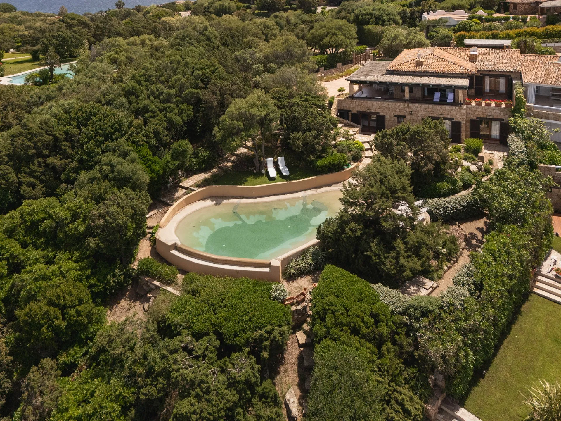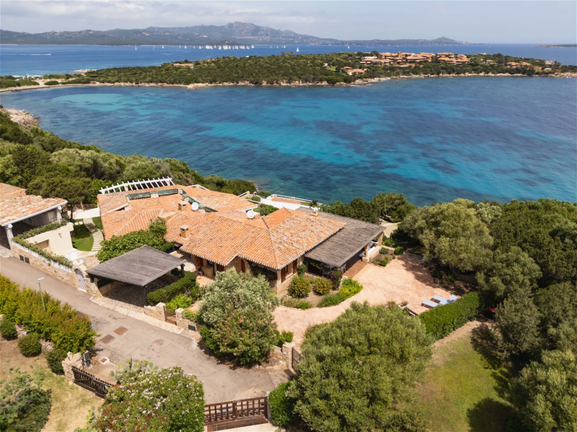 Surrounded by a lush park that gently slopes towards the sea, this pied dans l’eau residence is spread over two floors, offering breathtaking views of the promontory and direct access to crystal-clear waters. On the ground floor, the entrance leads to a spacious open-plan living area with a kitchen, an atrium that hosts the dining area, and an expansive living space where natural light embraces the interiors, creating a seamless dialogue between indoors and outdoors. On the same level, there is a bedroom with a private bathroom; both this room and the living area enjoy direct access to the perimeter terrace with sea views—an ideal setting for relaxation or social gatherings immersed in the beauty of the landscape. The lower floor, accessed via an internal staircase, comprises three spacious bedrooms, each with its own en-suite bathroom. Additionally, the floor includes a service room, perfectly designed to meet any residential needs. A covered patio equipped with a barbecue area further enhances the property, providing a perfect space to welcome friends and family in a comfortable and convivial setting. The vast private park gently leads down to the private dock, offering a unique experience of direct contact with the sea. The swimming pool, nestled in the greenery, provides another exclusive relaxation area. Two private parking spaces complete the property.