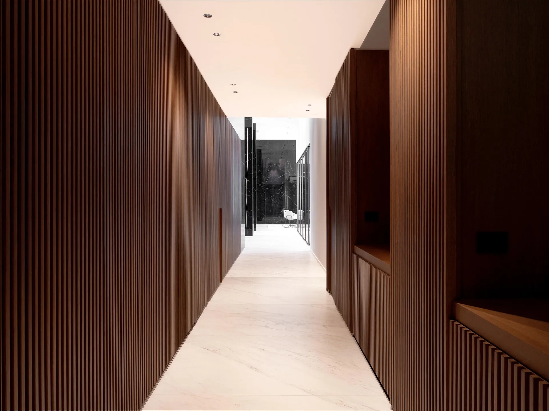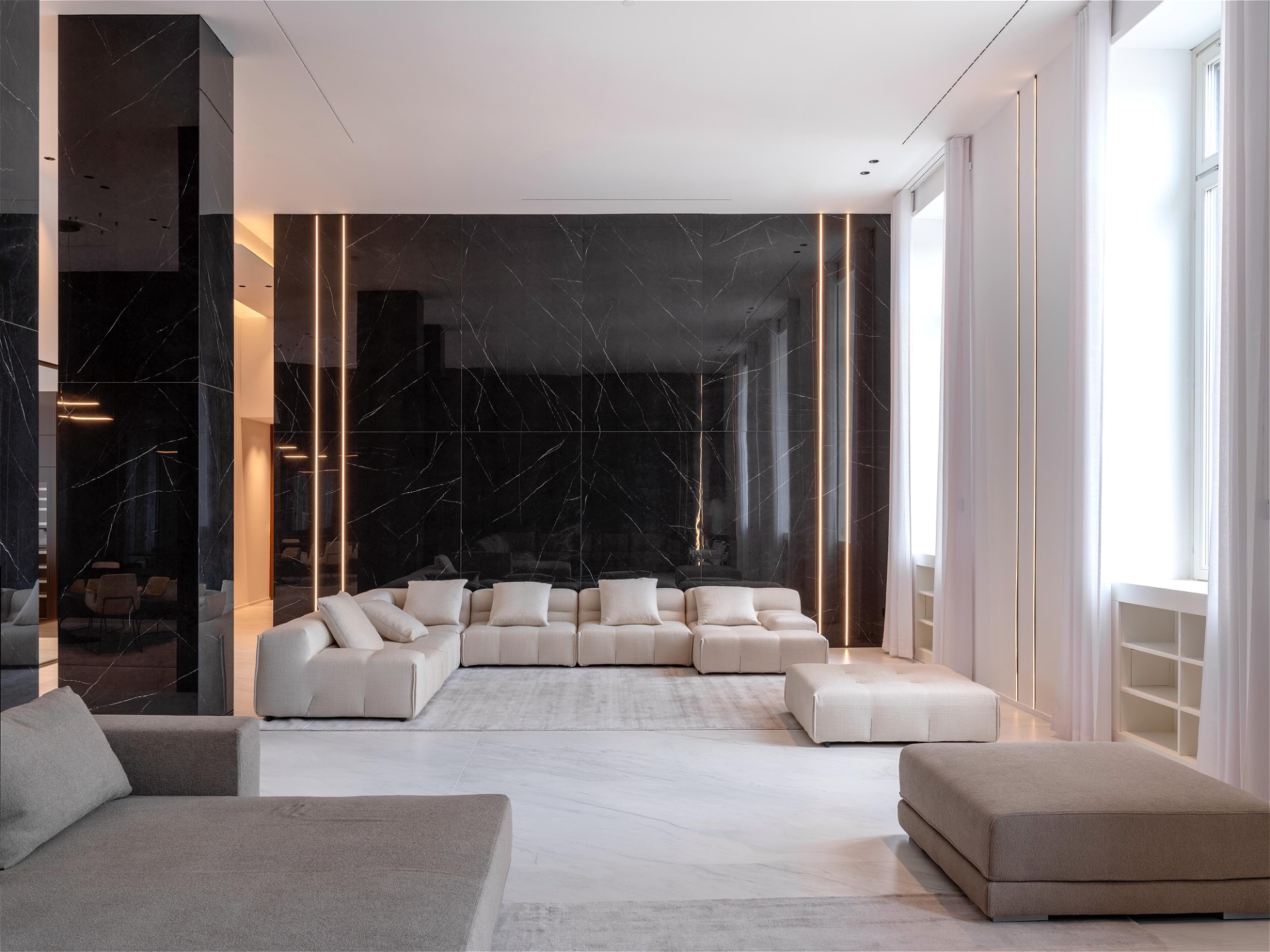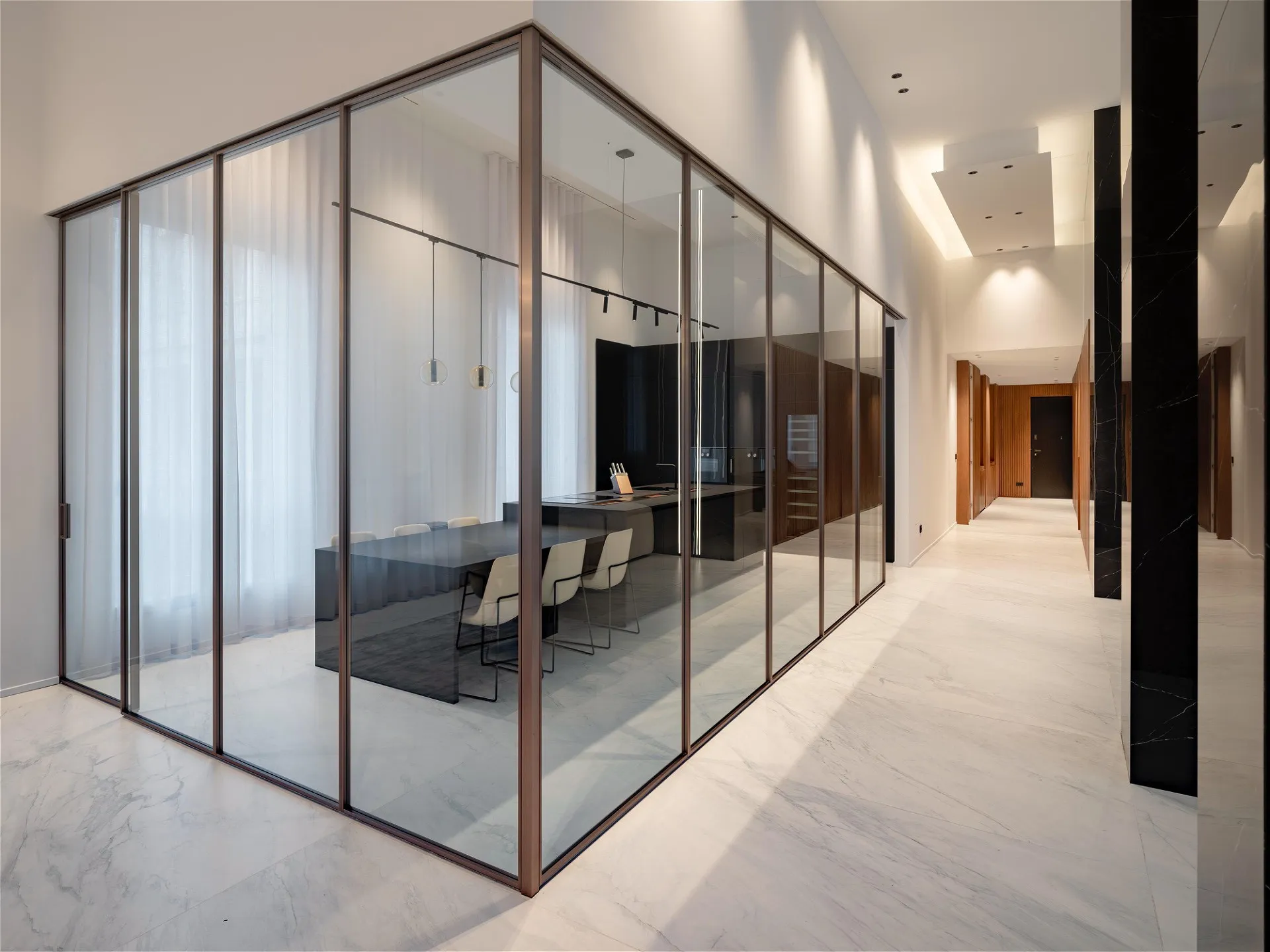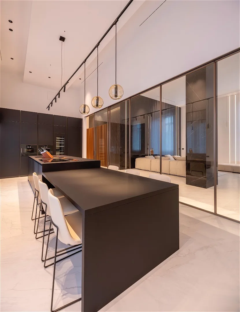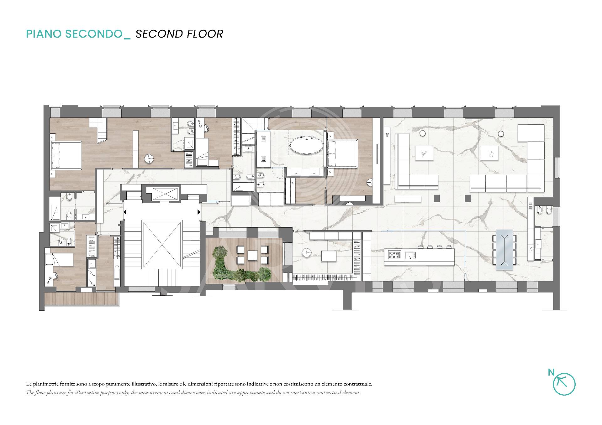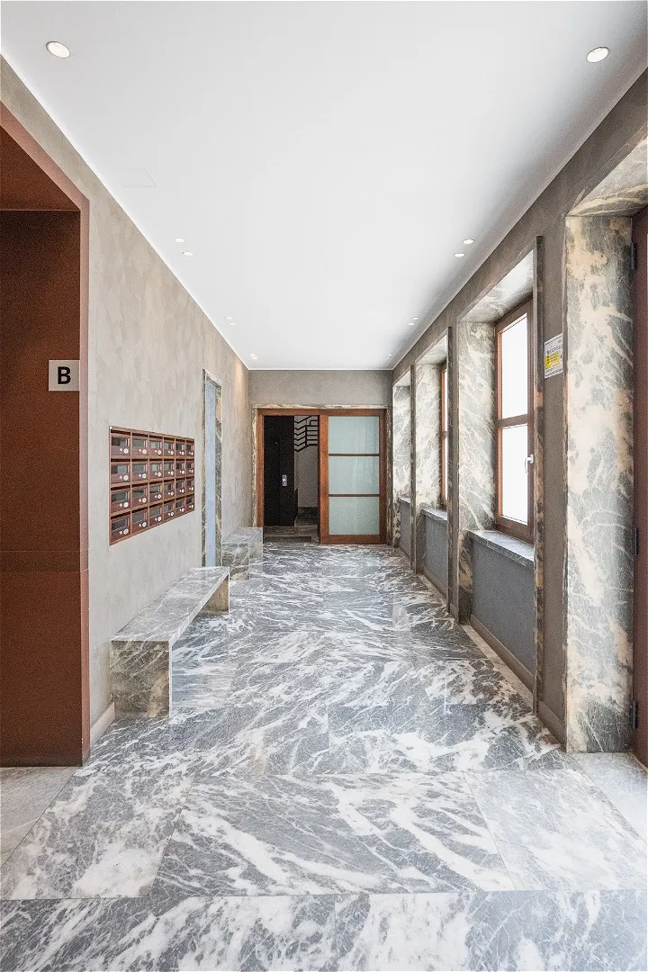 Al secondo piano di uno stabile signorile, questa residenza di pregio si svilup- pa interamente su un unico livello, esprimendo l’eccellenza abitativa in chiave contemporanea. L’ingresso introduce con discrezione agli ambienti, svelando un ambiente giorno dalle proporzioni importanti e dalla distribuzione fluida che dialoga con la cucina moderna tramite una parete vetrata scorrevole. Nel- la stessa zona, un bagno di servizio completa la funzionalità della zona gior- no. Un corridoio dalle geometrie pulite conduce a una seconda zona living: uno spazio interno discreto, separato dal cuore pulsante della casa, con vista sull’esterno. La zona notte si apre con una camera master dotata di cabina ar- madio walk-in e bagno en suite con vasca, seguita da quattro camere da letto ciascuna con bagno privato. Finiture di altissimo livello, pavimenti in mar- mo bianco venato, luminosità diffusa e design contemporaneo definiscono ogni ambiente. Inclusi nella proprietà: lavanderia dedicata e posto auto. Un equilibrio perfetto tra rigore formale e calore materico, pensato per chi cerca comfort, bellezza e centralità.