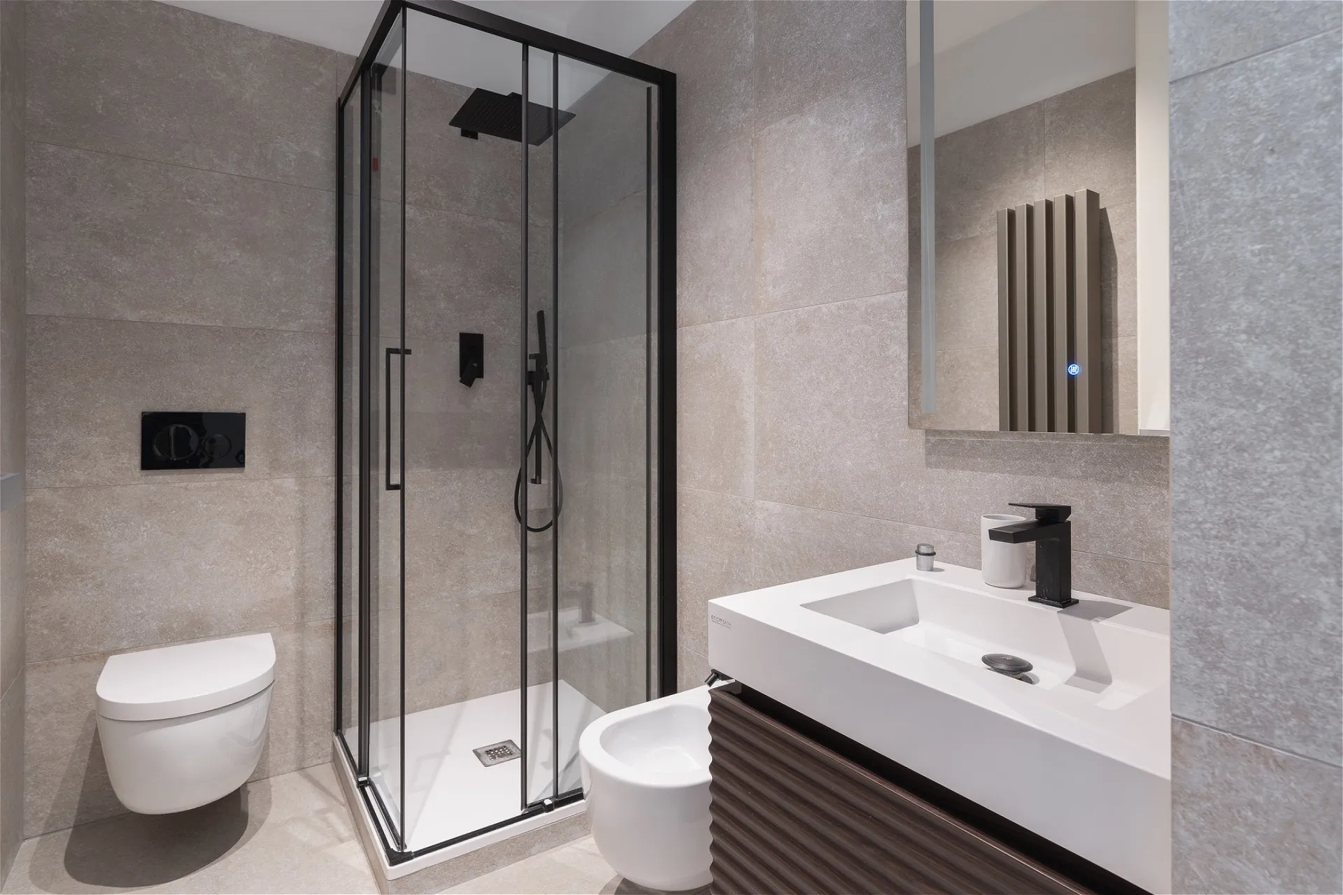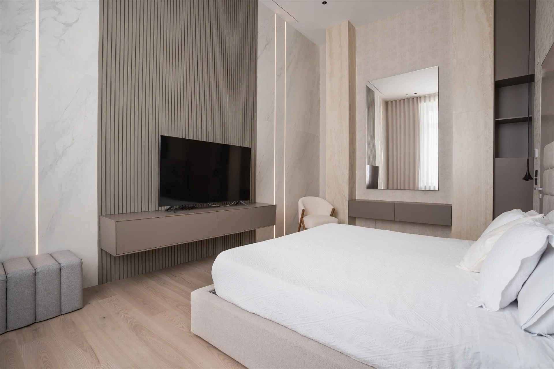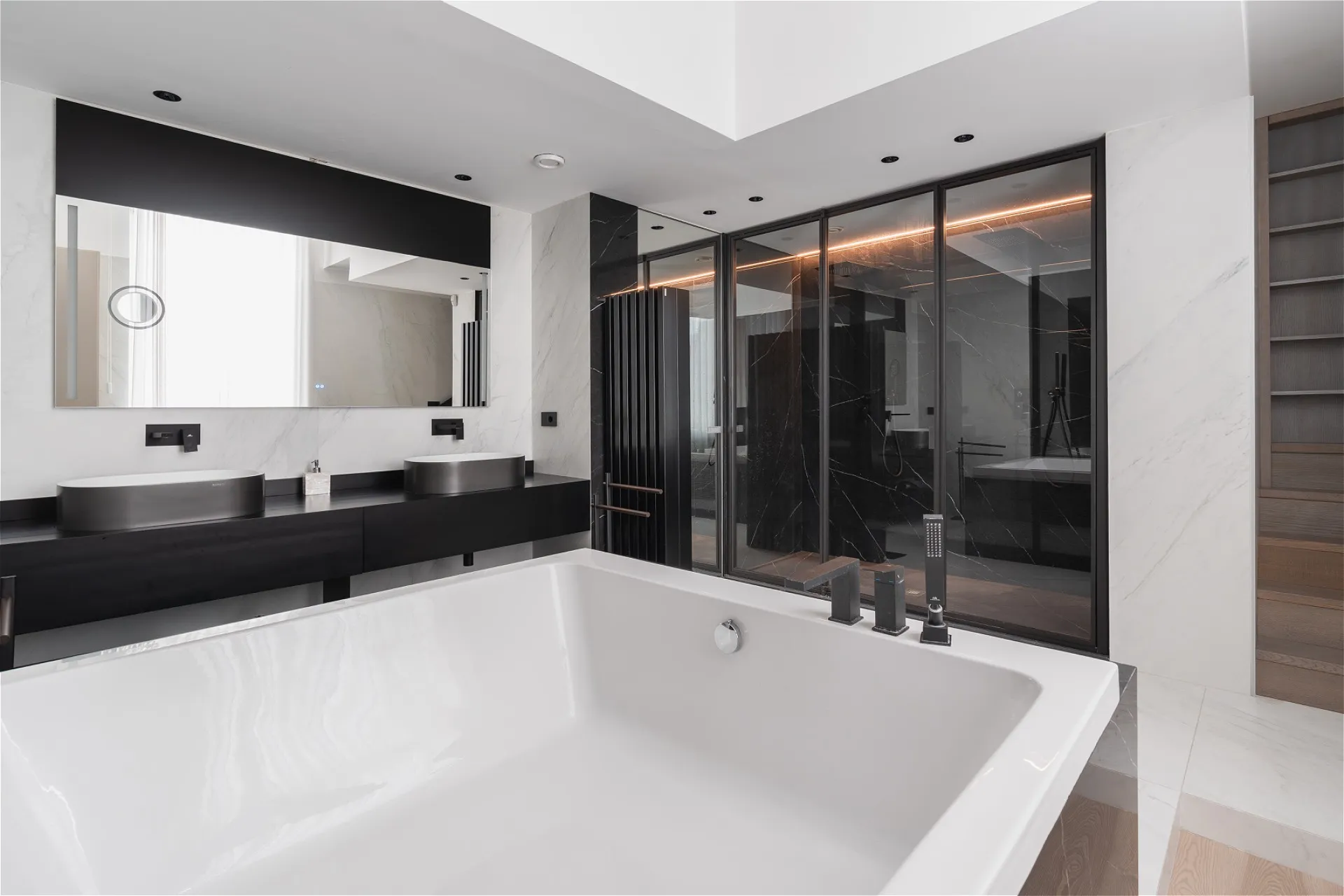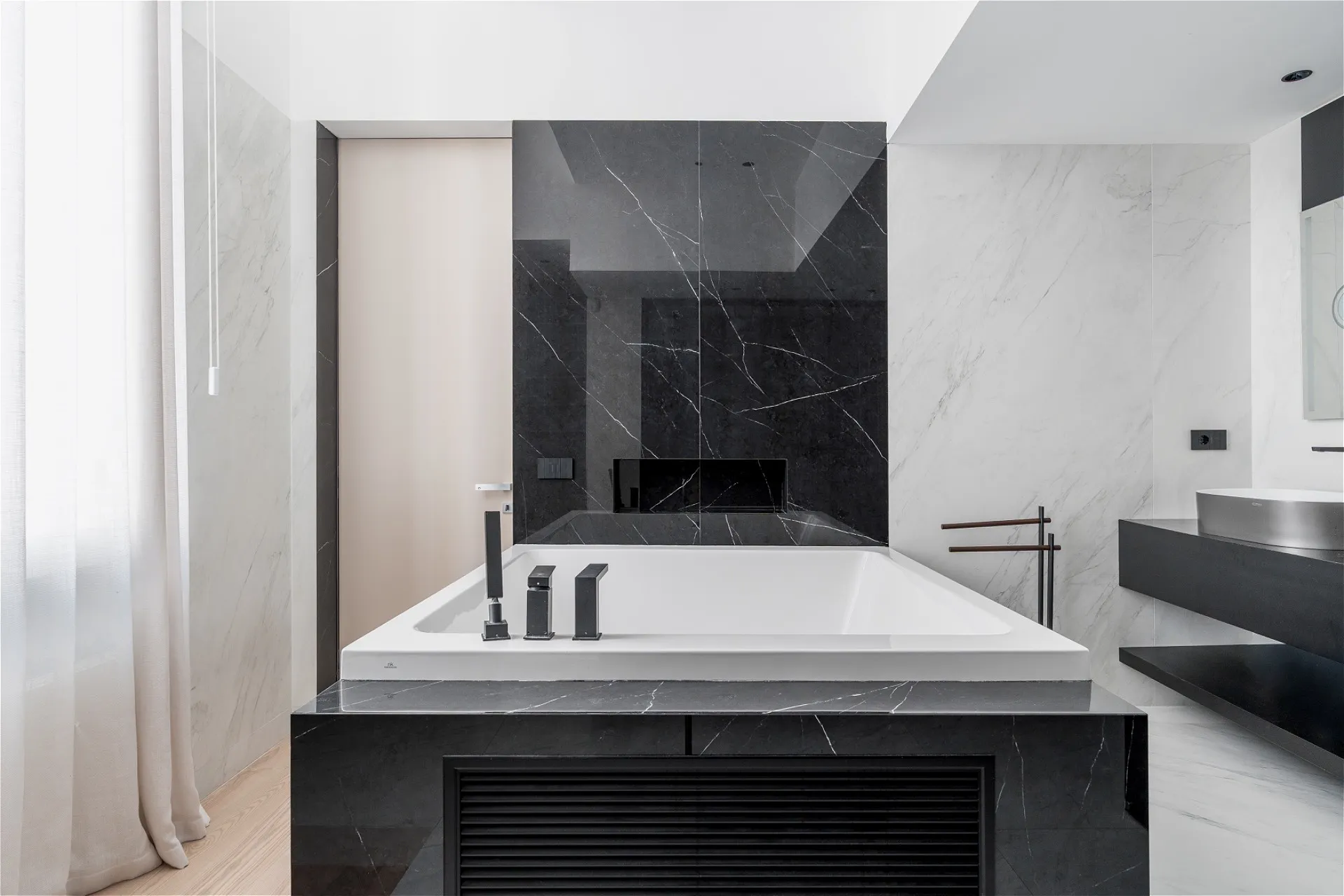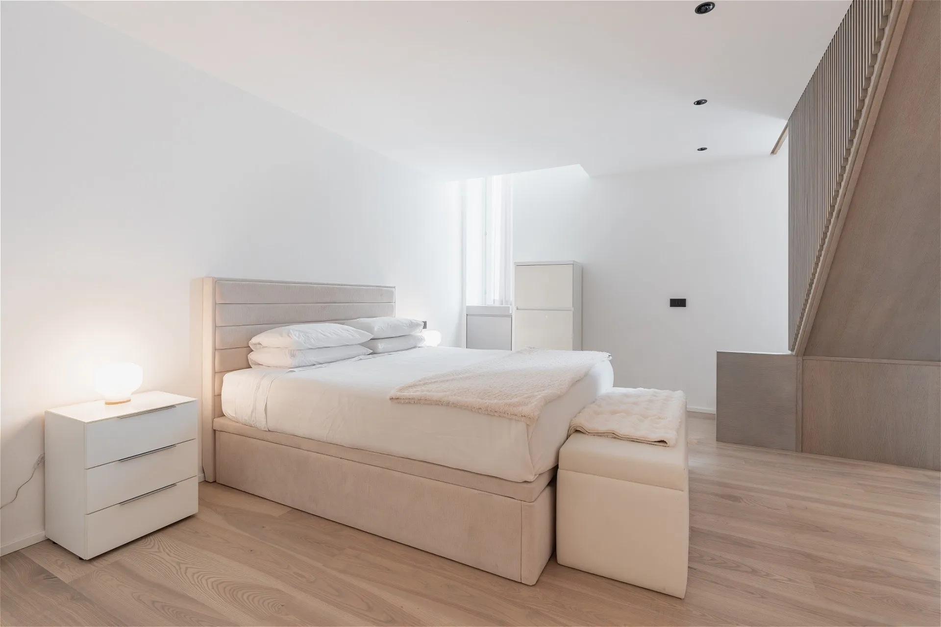 Al secondo piano di uno stabile signorile, questa residenza di pregio si svilup- pa interamente su un unico livello, esprimendo l’eccellenza abitativa in chiave contemporanea. L’ingresso introduce con discrezione agli ambienti, svelando un ambiente giorno dalle proporzioni importanti e dalla distribuzione fluida che dialoga con la cucina moderna tramite una parete vetrata scorrevole. Nel- la stessa zona, un bagno di servizio completa la funzionalità della zona gior- no. Un corridoio dalle geometrie pulite conduce a una seconda zona living: uno spazio interno discreto, separato dal cuore pulsante della casa, con vista sull’esterno. La zona notte si apre con una camera master dotata di cabina ar- madio walk-in e bagno en suite con vasca, seguita da quattro camere da letto ciascuna con bagno privato. Finiture di altissimo livello, pavimenti in mar- mo bianco venato, luminosità diffusa e design contemporaneo definiscono ogni ambiente. Inclusi nella proprietà: lavanderia dedicata e posto auto. Un equilibrio perfetto tra rigore formale e calore materico, pensato per chi cerca comfort, bellezza e centralità.